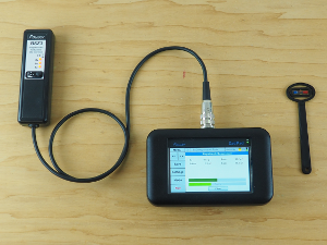 The measurement is performed using broadband RF field probes or frequency-selective spectrum analyzers to identify the source based on the frequency used.